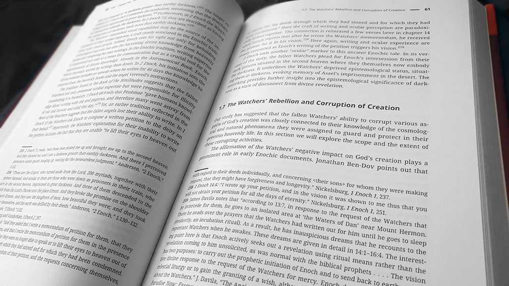 The theme of the Watchers as now disgraced custodians of divine knowledge meshes wonderfully with the role Enoch plays in Enochian literature, in which the formerly mortal patriarch is depicted being elevated to a divine status. With that apotheosis, Enoch seemingly takes over many of the past nomothetic functions of the Watchers, almost as if heaven despaired of their prior distributed-responsibility low-level employment model and found a singular, trusted upper middle management power-user more palatable. Indeed, Orlov argues throughout that the corruption caused by the Watchers’ illicit revelation of heavenly mysteries is mitigated by the way in which Enoch is given access to thematically similar clusters of secrets.